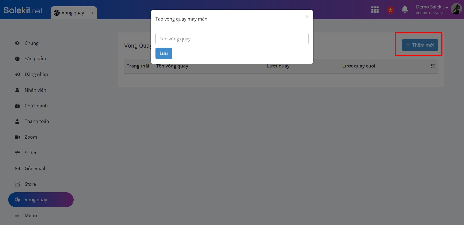 Bạn vào mục Cài đặt >> Vòng quay >> chọn +Thêm mới >> nhập tên vòng quay >> Lưu.