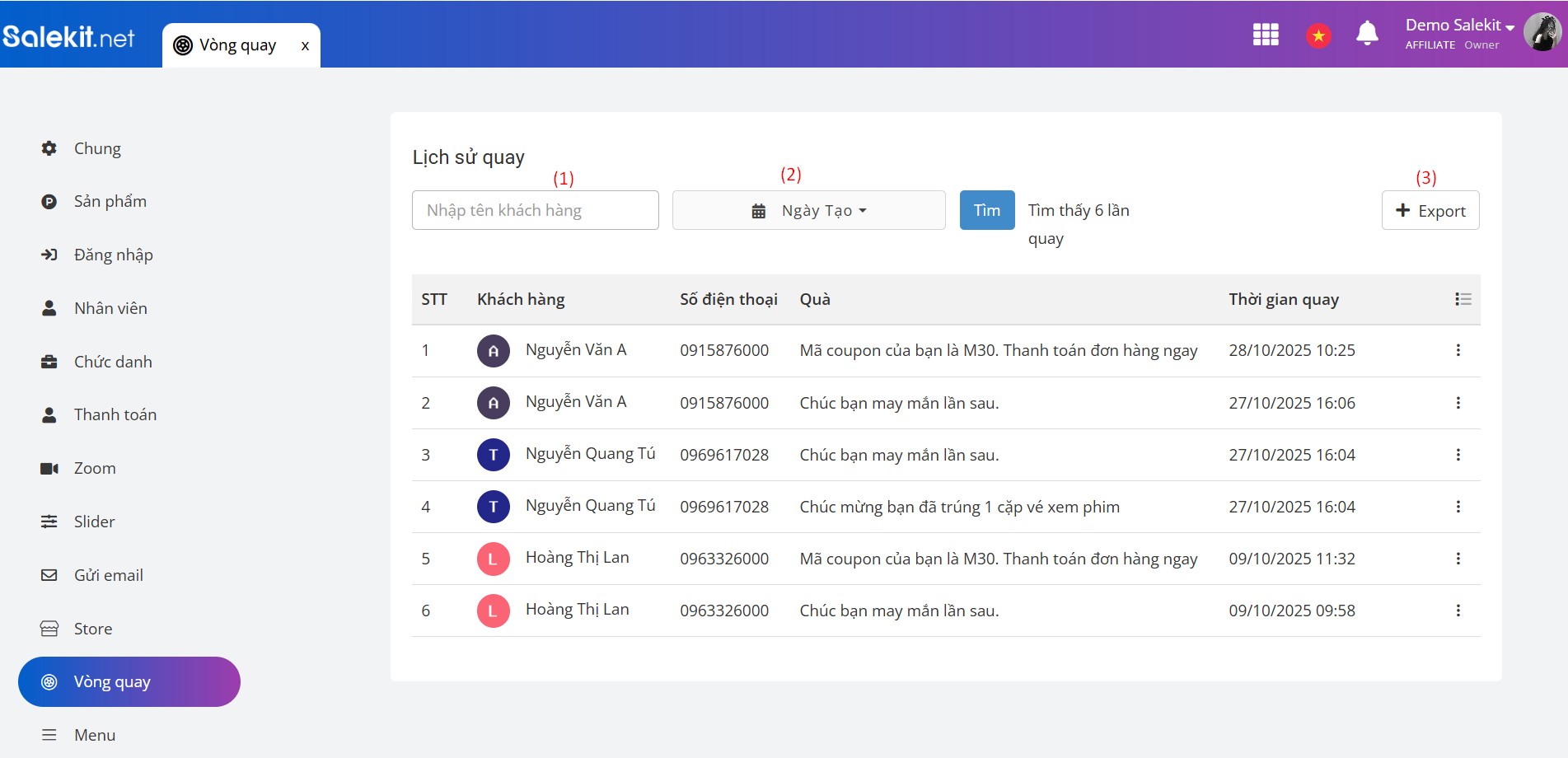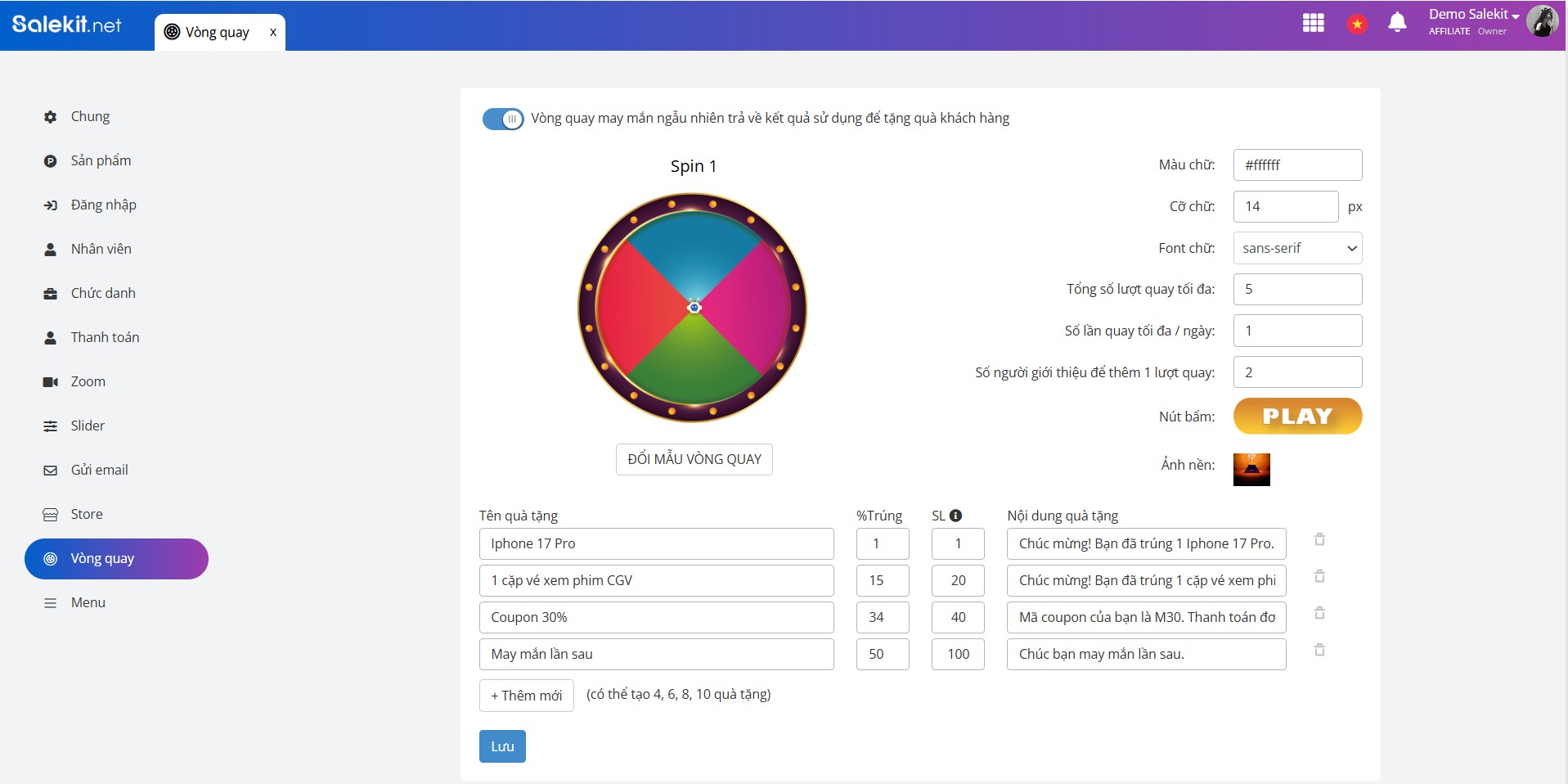 Salekit.net thêm tính năng vòng quay may mắn giúp bạn tạo nhanh vòng quay để tặng quà cho khách hàng. Bạn có thể tùy chỉnh được số lượng, tỷ lệ trúng quà theo mong muốn của mình.