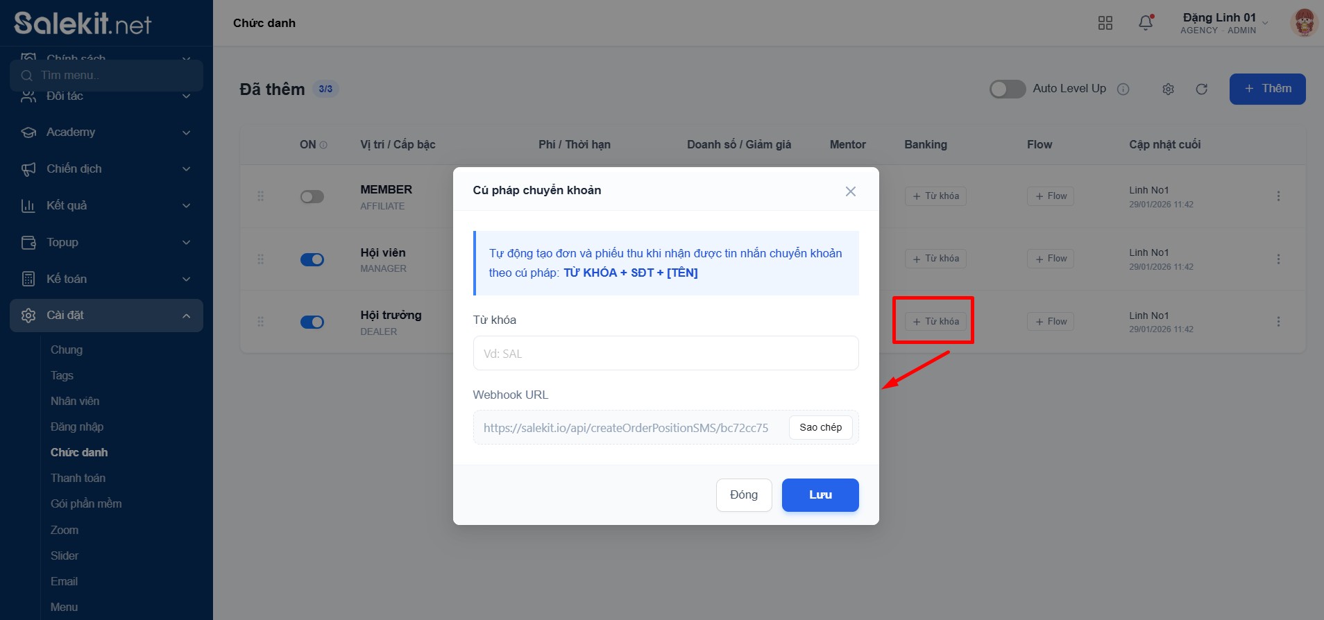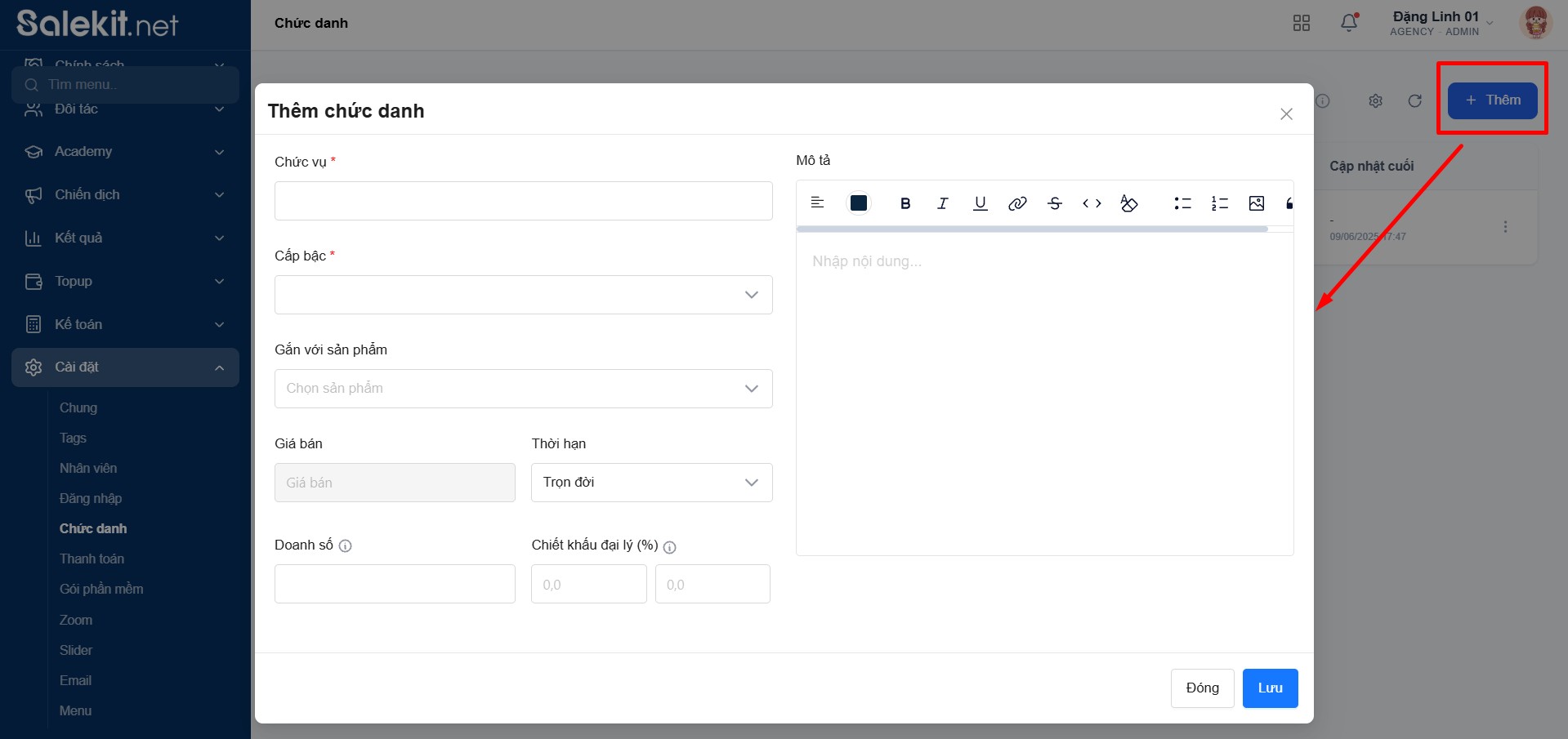 Sau khi điền đủ thông tin, bạn nhấn Lưu để hoàn tất thiết lập chức danh.