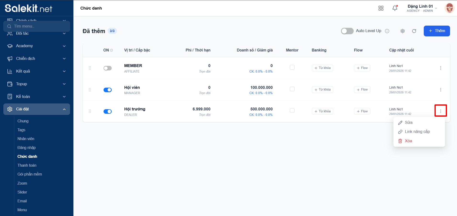 Bên cạnh các cấp bậc thành viên có sẵn của hệ thống như Affiliate, Manager, Dealer, Director, Network, chủ shop có thể cài đặt các chức danh riêng để quản lý, phân cấp các thành viên trong shop của mình. Chức danh được hưởng hoa hồng, chiết khấu theo cài đặt chính sách hoa hồng trong shop.