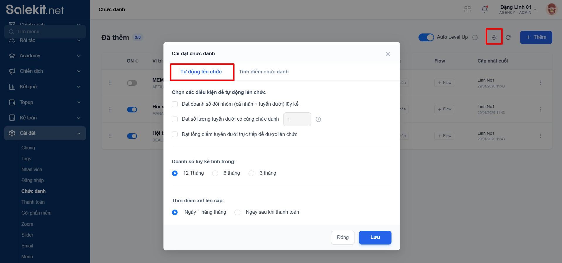 +Tự động lên chức: Tại đây bạn sẽ cài đặt các điều kiện để tự động lên chức, thời gian tính doanh số và thời điểm xét lên cấp.