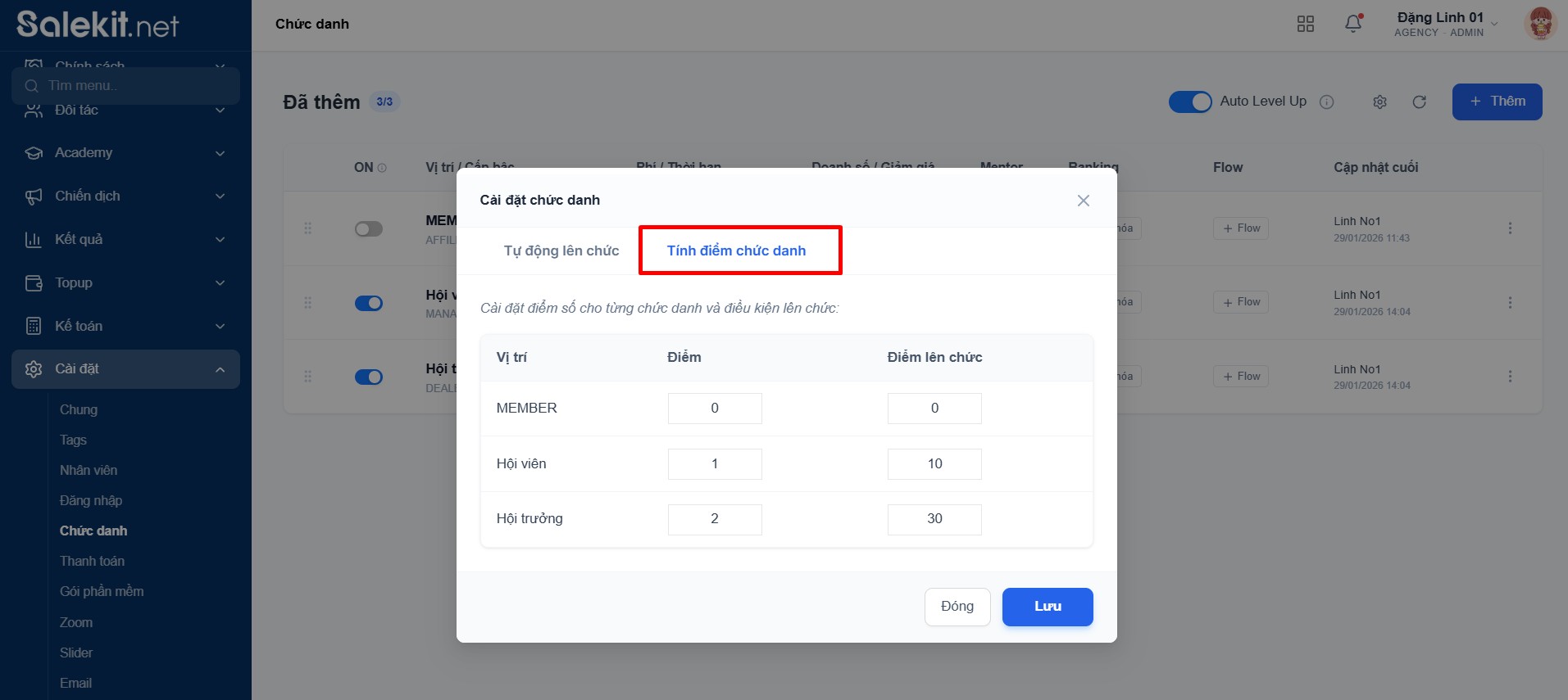 +Tích điểm chức danh: Bạn cài đặt điểm cho từng chức danh và điều kiện lên chức