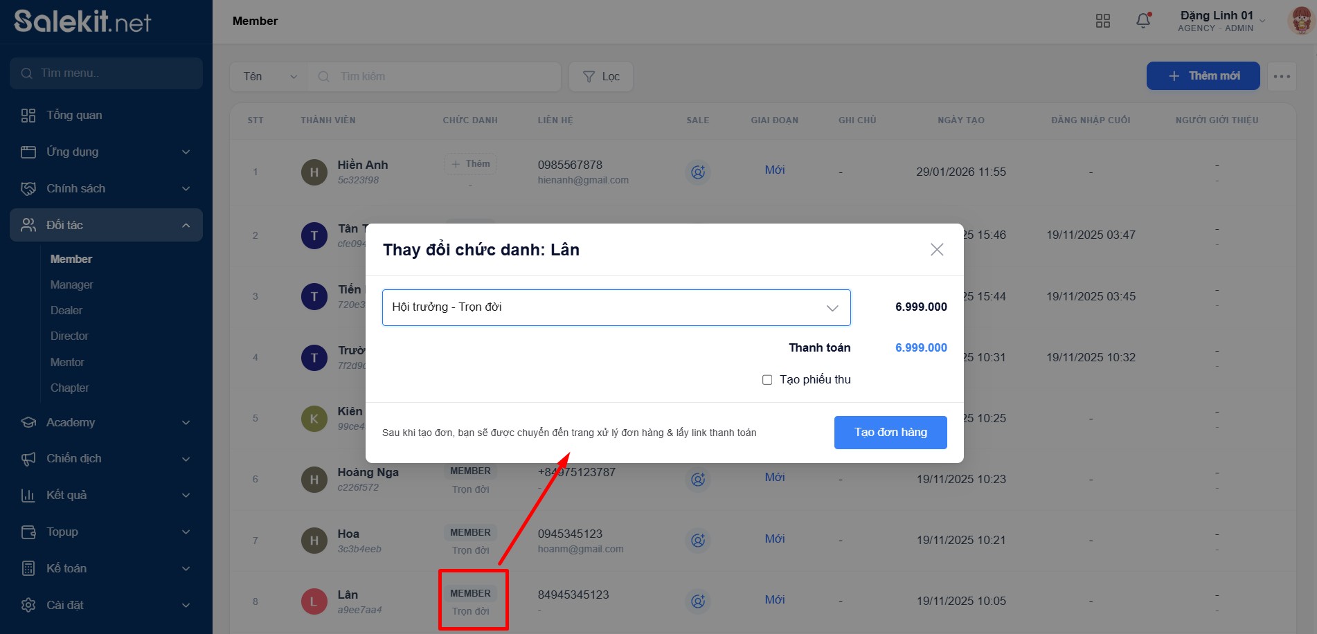 Chủ shop nhấn vào Tạo đơn tại chức danh trả phí >> tìm thành viên theo tên/sdt/email >> Tạo đơn >> Hệ thống tạo đơn hàng với sản phẩm là chức danh.