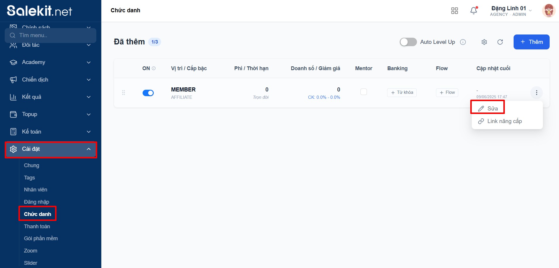Với các shop trả phí từ Affiliate trở lên, bạn có thể truy cập mục Chức danh để OFF chức danh Member nếu không muốn dùng hoặc Sửa để tạo chức danh riêng theo ý muốn.