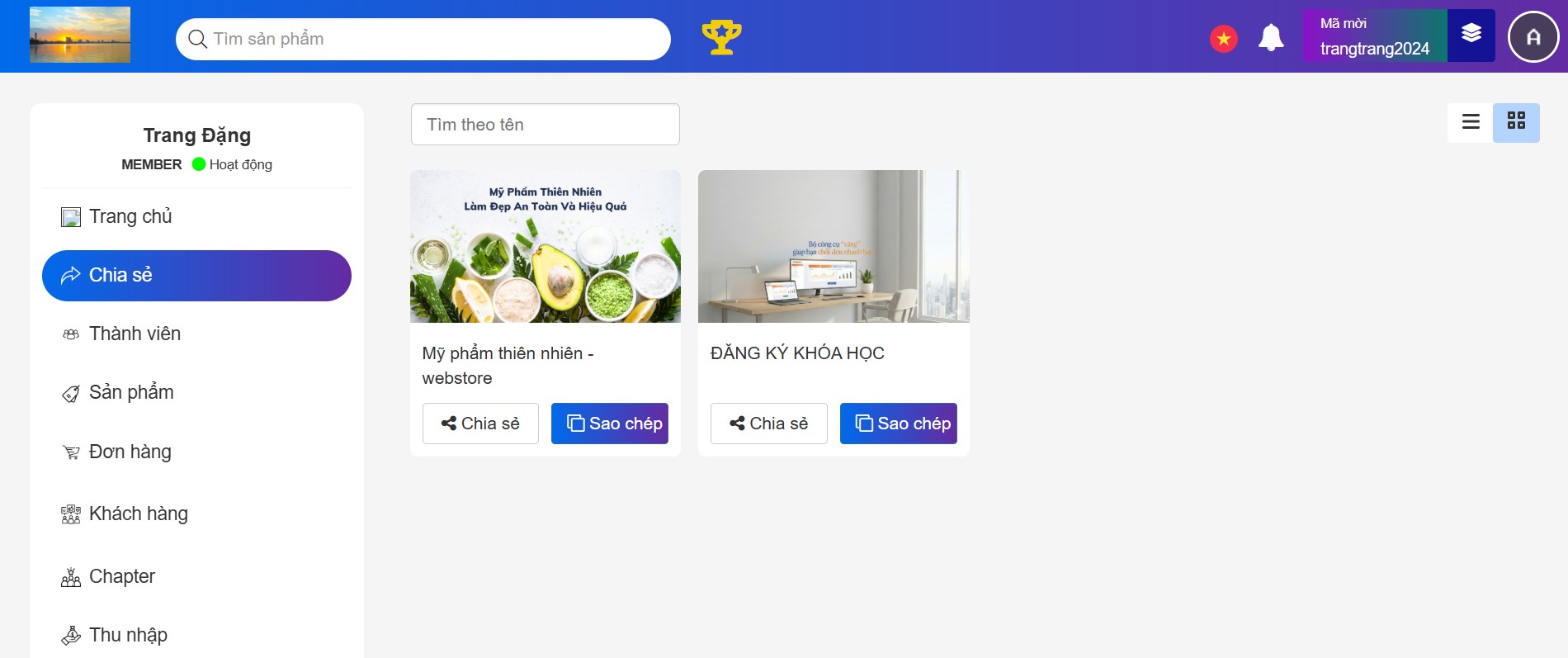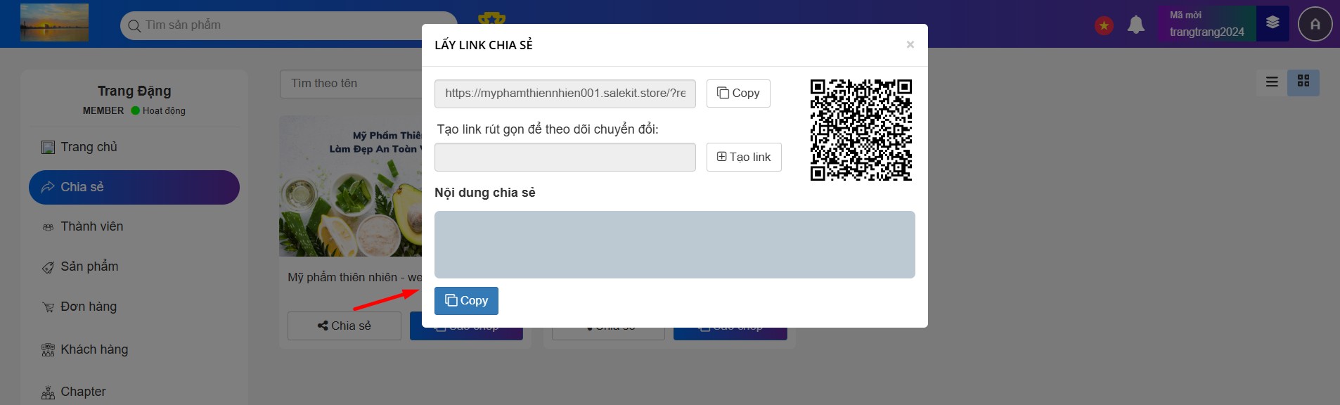 Thành viên đăng nhập tài khoản cộng tác viên của mình, chọn mục Chia sẻ: