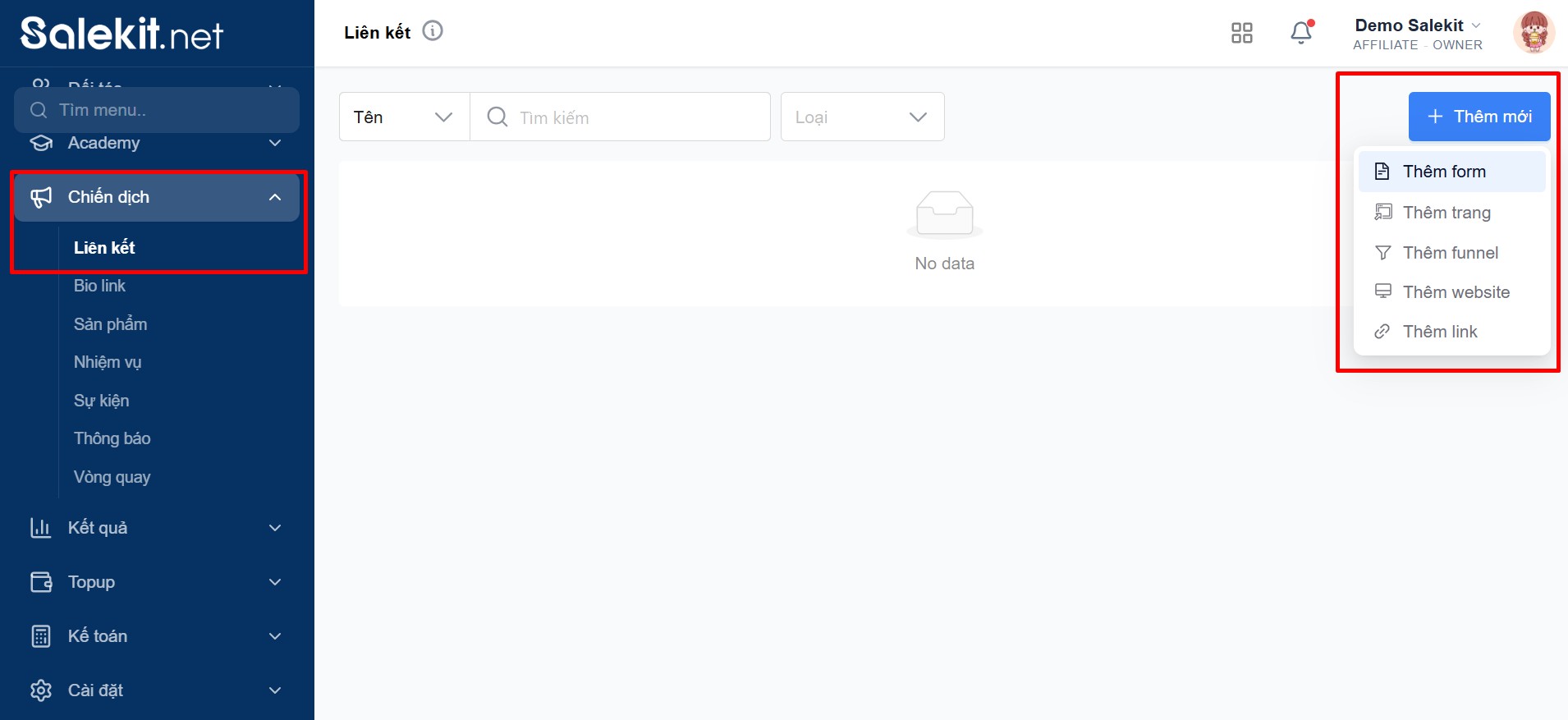 Đầu tiên trong menu, bạn chọn cột Chiến dịch >> Liên kết >> +Thêm mới:
