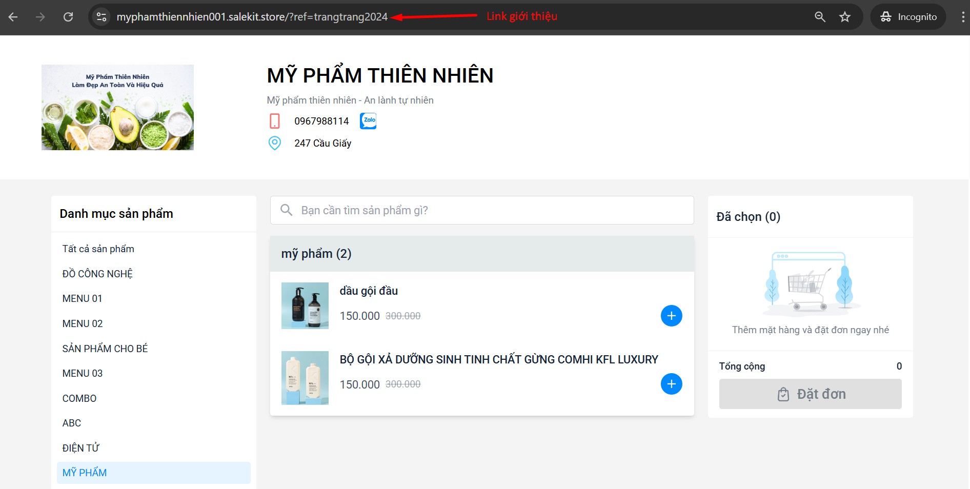 Dưới đây chúng tôi đang thao tác thêm link webstore tạo trên salekit.net vào làm liên kết giới thiệu trong shop: