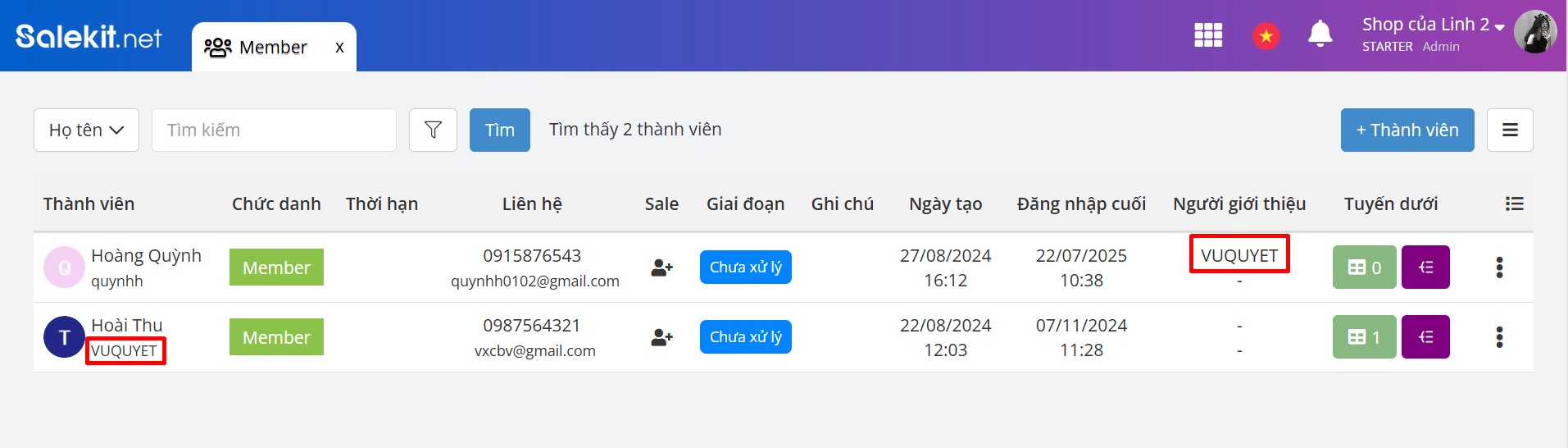 Thành viên hạ cấp thành công sẽ được đưa ra khỏi mục Member và chỉ lưu thông tin trong contact trên Salekit.io.