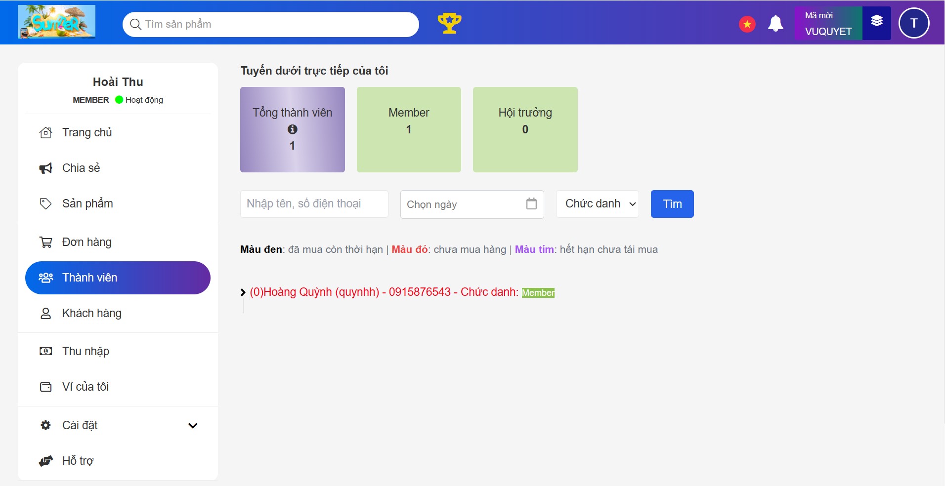 Trên tài khoản của mình, Hoài Thu có thể xem và quản lý danh sách các thành viên tuyến dưới trong mục Thành Viên: