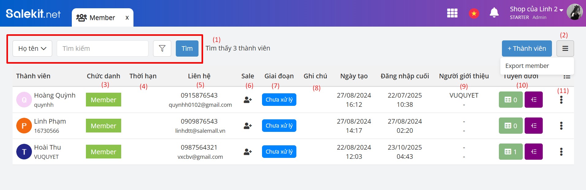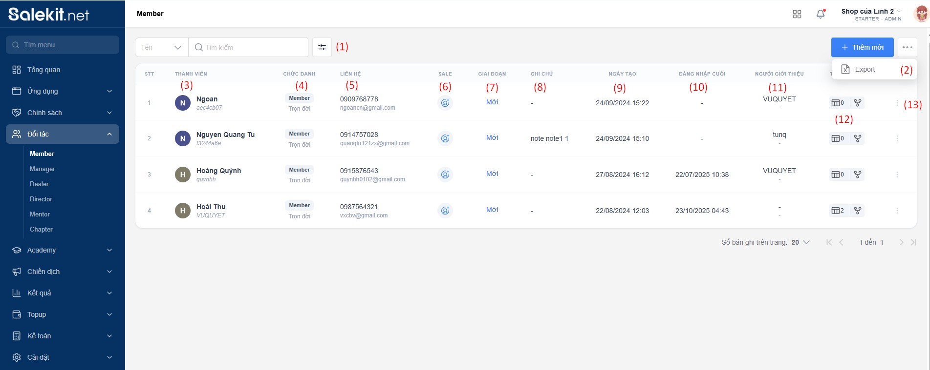 Danh sách thành viên của shop được thống kê trong mục Member: