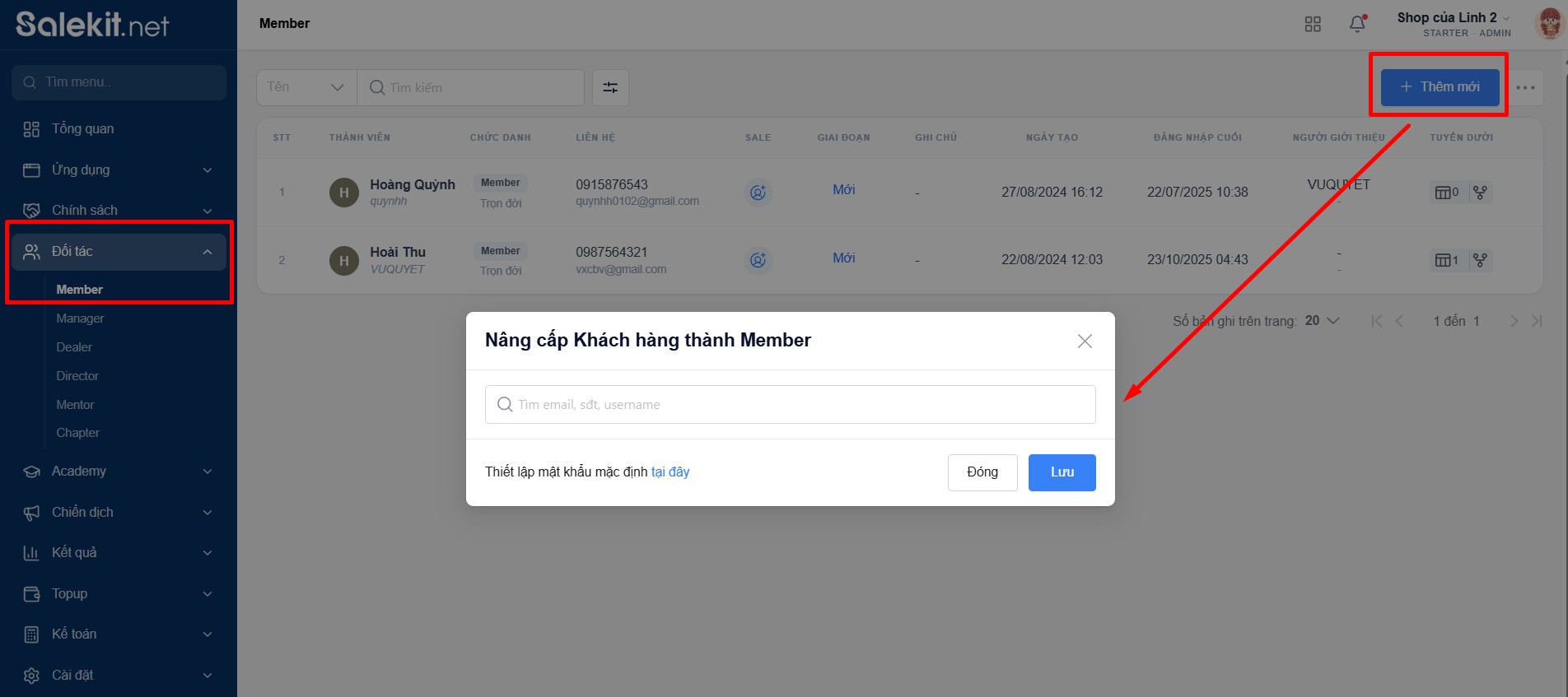 Chủ shop vào mục Đối tác >> Member >> chọn +Thêm mới >> Nhập username/phone/email của khách hàng đã có trên Salekit >> Tìm >> Lưu.