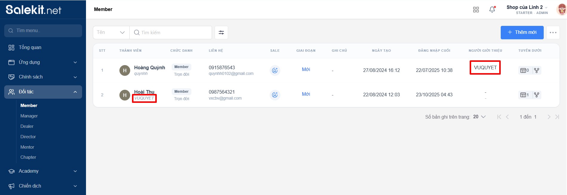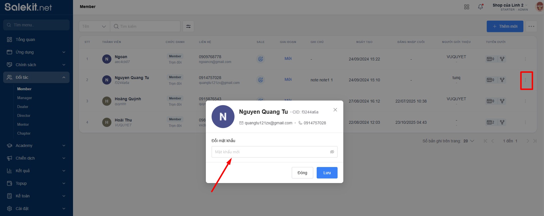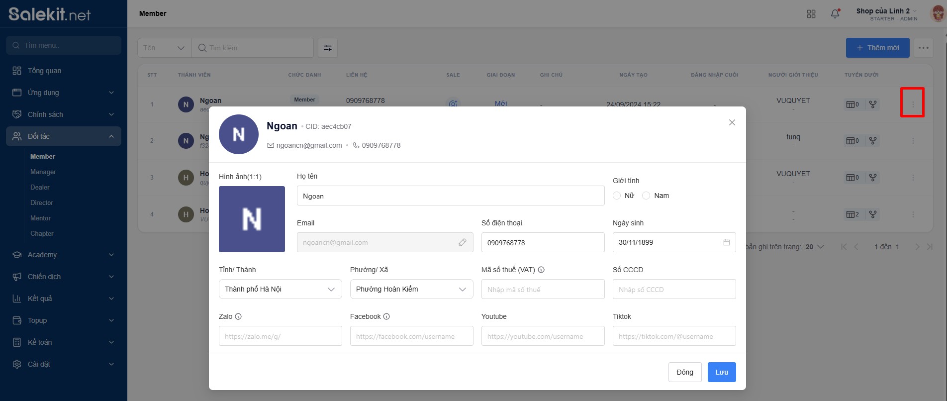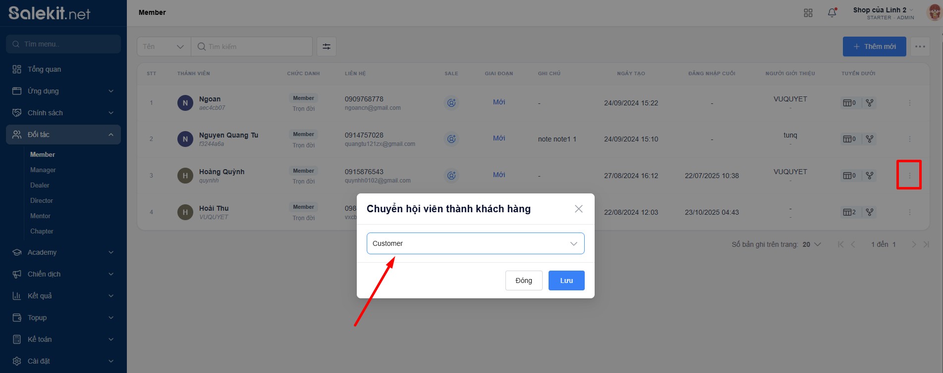 Member là nơi chủ shop quản lý danh sách thành viên của shop mình. Tại đây chủ shop có thể chỉnh sửa thông tin, nâng/hạ cấp bậc thành viên, ....