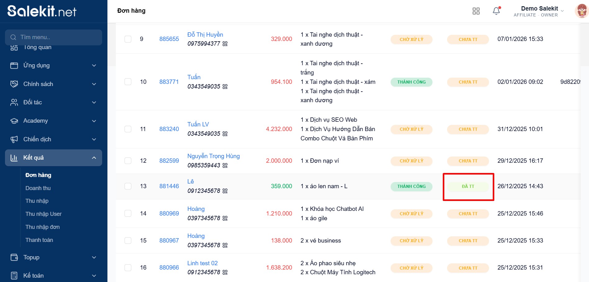 Đồng thời đơn hàng trên Salekit.net được cập nhật trạng thái thanh toán sang Đã thanh toán: