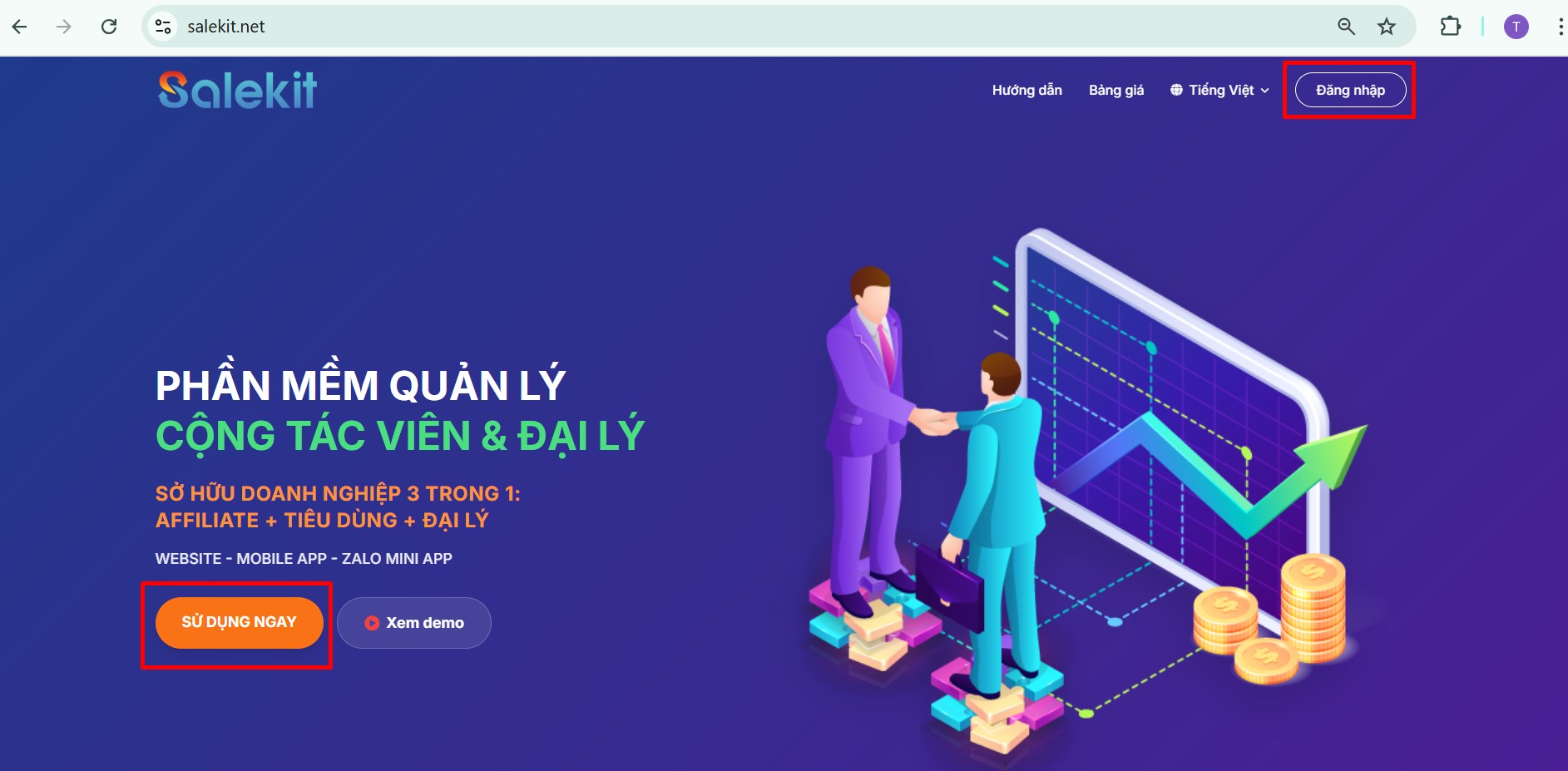 Để đăng nhập tài khoản Salekit.net, bạn truy cập website Salekit.net > click Đăng nhập hoặc Sử dụng ngay.