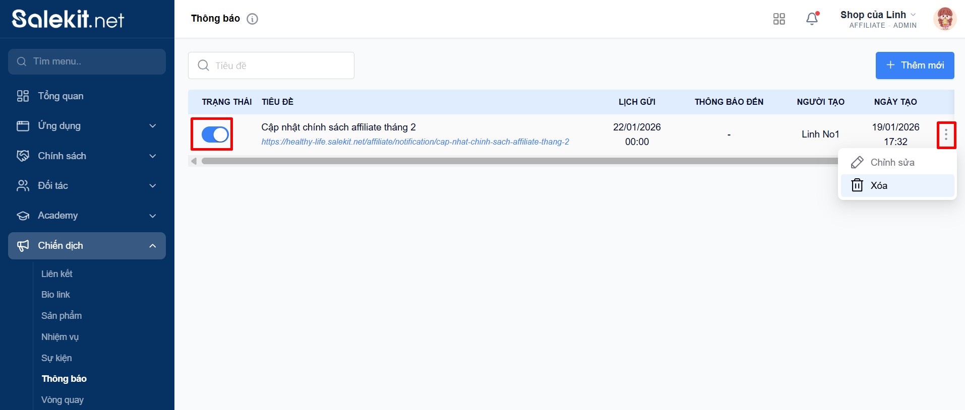 Đầu tiên, bạn đăng nhập shop Salekit.net >> chọn Menu >> Chiến dịch >> Thông báo >> chọn +Thêm mới, hệ thống hiển thị popup như hình: